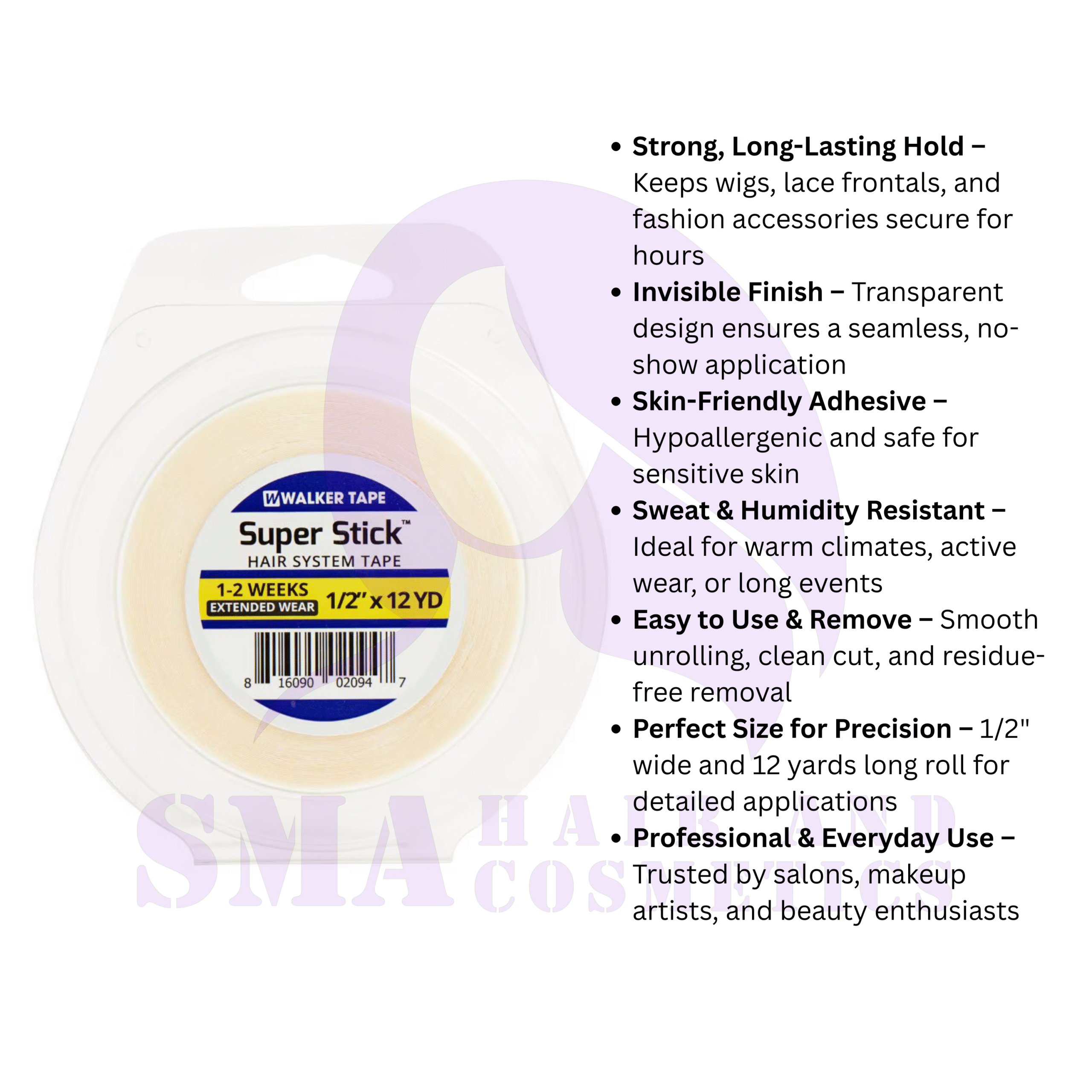 Achieve flawless, long-lasting hold with the SMA Super Stick Cosmetic Tape, expertly crafted for professional and personal beauty applications. Measuring 1/2 inch wide and 12 yards long, this ultra-durable, double-sided tape roll is your go-to solution for securing wigs, lace frontals, toupees, fashion garments, body jewelry, and more. Designed with both performance and comfort in mind, the SMA Super Stick provides an invisible, secure bond that lasts for hours—perfect for all-day wear, photo shoots, performances, or everyday beauty needs.